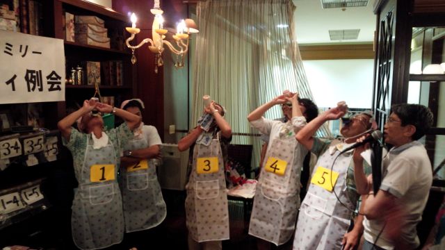 パーティー2部の司会を仰せつかりました、蠣原・内田のコンビです。二人で浴衣をきて張り切って颯爽と登場いたしました。しかし、・・・打合せが悪く、進行が粗雑になり、大変申し訳なかったです。こんな時頼りになるのは、やはりパーティーの仕切り大先輩の金澤メンと仲井メンです。ほとんど、お二人に任せて、美味しいスパゲティなどをバクバクと、食べていたのは、私です。パーティの内容は、いつもの明るい飲み会と、そうそうゲームがありました。”馬の出走”です第5レースまでしっかり考えて、皆さんとても真剣でした・・